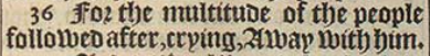 36 Denn die Menge der Leute folgte nach und schrie: "Hinweg mit ihm."