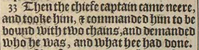 33 Then the chiefe captain came neere, and tooke him, & commanded him to be bound with two chains, and demanded who he was, and what hee had done.