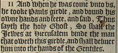 11And when he was come vnto vs, he tooke Pauls girdle, and bound his owne hands and feete, and said, Thus sayth the holy Ghost, So shall the Iewes at Hierusalem binde the man that oweth this girdle, and shall deliuer him into the hands of the Gentiles.