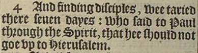 4 And finding disciples, wee taried there seuen dayes: who said to Paul through the Spirit, that hee should not goe vp to Hierusalem.