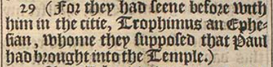29 (For they had seene before with him in the citie, Trophimus an Ephesian, whome they supposed that Paul had brought into the Temple.)