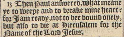 13 Then Paul answered, What meane ye to weepe and to breake mine heart? for I am ready, not to bee bound onely, but also to die at Hierusalem for the Name of the Lord Iesus.