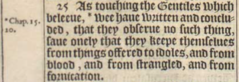 25 As touching the Gentiles which beleeue, *wee haue written and concluded, that they obserue no such thing, saue onely that they keepe themselues from things offered to idoles, and from blood, and from strangled, and from fornication.[*Chap.15. 20.]