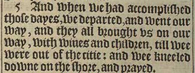 5 And when we had accomplished those dayes, we departed, and went our way, and they all brought vs on our way, with wiues and children, till wee were out of the citie: and wee kneeled downe on the shore, and prayed.