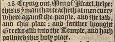 28 Und schrien "Ihr Männer von Israel, helft: Dies ist der Mann, der alle Leute überall gegen die Leute und das Gesetz und diesen Ort lehrt: Und ferner auch Griechen in den Tempel brachte und diesen heiligen Ort verunreinigt hat."