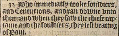 32 Who immediatly tooke souldiers, and Centurions, and ran downe vnto them: and when they saw the chiefe captaine and the souldiers, they left beating of Paul.