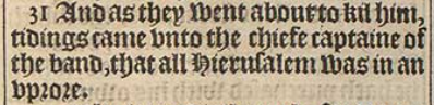 31 And as they went about to kil him, tidings came vnto the chiefe captaine of the band, that all Hierusalem was in an vprore.