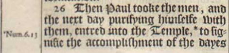 26 Then Paul tooke the men, and the next day purifying himselfe with them, entred into the Temple, *to signifie the accomplishment of the dayes of purification, vntill that an offering should be offered for euery one of them:[* Num.6.13]