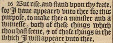 16 But rise, and stand vpon thy feete, for I haue appeared vnto thee for this purpose, to make thee a minister and a witnesse, both of these things which thou hast seene, & of those things in the which I will appeare vnto thee,