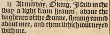 13 At midday, O king, I saw in the way a light from heauen, aboue the brightnes of the Sunne, shining round about mee, and them which iourneyed with me.