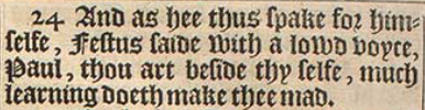 24 And as hee thus spake for himselfe, Festus saide with a lowd voyce, Paul, thou art beside thy selfe, much learning doeth make thee mad.