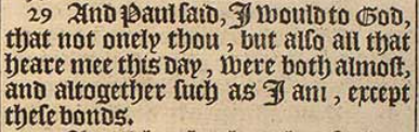 29 And Paul said, I would to God, that not onely thou, but also all that heare mee this day, were both almost, and altogether such as I am, except these bonds.