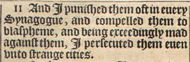 11And I punished them oft in euery Synagogue, and compelled them to blaspheme, and being exceedingly mad against them, I persecuted them euen vnto strange cities.