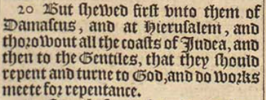20 But shewed first vnto them of Damascus, and at Hierusalem, and thorowout all the coasts of Iudea, and then to the Gentiles, that they should repent and turne to God, and do works meete for repentance.