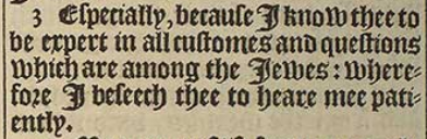 3 Especially, because I know thee to be expert in all customes and questions which are among the Iewes: wherefore I beseech thee to heare mee patiently.