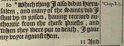 10 *Which thing I also did in Hierusalem, and many of the Saints did I shut vp in prison, hauing receiued authoritie from the chiefe Priests, and when they were put to death, I gaue my voyce against them.[*Chap. 8.3.]