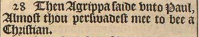 28 Then Agrippa saide vnto Paul, Almost thou perswadest mee to bee a Christian.