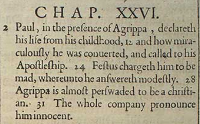 2 In Anwesenheit von Agrippa erklärt Paulus sein Leben von seiner Kindheit an 12 und wie er wundersam bekehrt und zum Apostelamt berufen wurde. 24 Festus wirft ihm vor verrückt zu sein, worauf er bescheiden antwortet. 28 Agrippa wird fast überredet, ein Christ zu sein. 31 Die ganze Gesellschaft erklärt ihn für unschuldig.