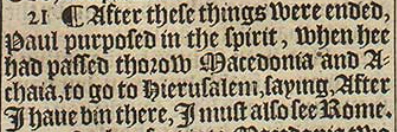 21 ¶ After these things were ended, Paul purposed in the spirit, when hee had passed thorow Macedonia and Athaia, to go to Hierusalem, saying, After I haue bin there, I must also see Rome.