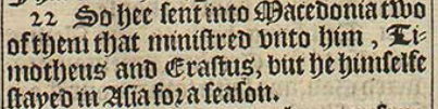22 So hee sent into Macedonia two of them that ministred vnto him, Timotheus and Erastus, but he himselfe stayed in Asia for a season.