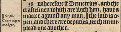38 Wherefore if Demetrius, and the craftesmen which are with him, haue a matter against any man, || the law is open, and there are deputies, let them implead one another. [ || Or, the Court dayes are kept. ]