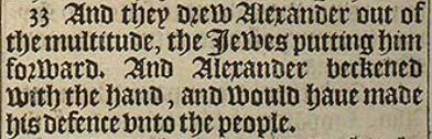 33 And they drew Alexander out of the multitude, the Iewes putting him forward. And Alexander beckened with the hand, and would haue made his defence vnto the people.