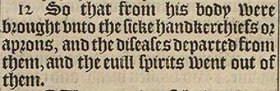 12 So that from his body were brought vnto the sicke handkerchiefs or aprons, and the diseases departed from them, and the euill spirits went out of them.