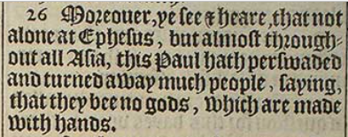 26 Moreouer, ye see & heare, that not alone at Ephesus, but almost throughout all Asia, this Paul hath perswaded and turned away much people, saying, that they bee no gods, which are made with hands.
