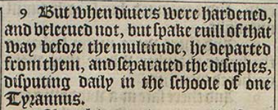 9 But when diuers were hardened, and beleeued not, but spake euill of that way before the multitude, he departed from them, and separated the disciples, disputing daily in the schoole of one Tyrannus.