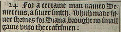 24 For a certaine man named Demetrius, a siluer smith, which made siluer shrines for Diana, brought no small gaine vnto the craftsmen: