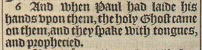 6 And when Paul had laide his hands vpon them, the holy Ghost came on them, and they spake with tongues, and prophecied.