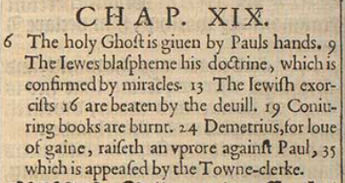 6 The holy Ghost is giuen by Pauls hands. 9 The Iewes blaspheme his doctrine, which is confirmed by miracles. 13 The Iewish exorcists 16 are beaten by the deuill. 19 Coniuring books are burnt. 24 Demetrius, for loue of gaine, raiseth an vprore against Paul, 35 which is appeased by the Towne-clerke.