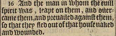 16 And the man in whom the euill spirit was, leapt on them, and ouercame them, and preuailed against them, so that they fled out of that house naked and wounded.