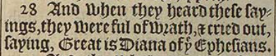 28 And when they heard these sayings, they were ful of wrath, & cried out, saying, Great is Diana of þe Ephesians.
