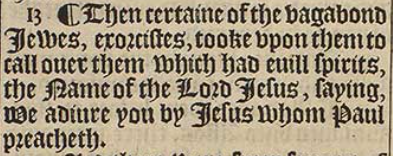 13 ¶ Then certaine of the vagabond Iewes, exorcistes, tooke vpon them to call ouer them which had euill spirits, the Name of the Lord Iesus, saying, We adiure you by Iesus whom Paul preacheth.