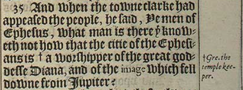 35 And when the towne clarke had appeased the people, he said, Ye men of Ephesus, what man is there þt knoweth not how that the citie of the Ephesians is +a worshipper of the great goddesse Diana, and of the image which fell downe from Iupiter? [+Gre. the temple keeper. ]