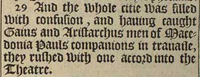 29 And the whole citie was filled with confusion, and hauing caught Gaius and Aristarchus men of Macedonia Pauls companions in trauaile, they rushed with one accord into the Theatre.