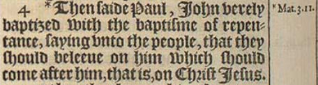 4 *Then saide Paul, Iohn verely baptized with the baptisme of repentance, saying vnto the people, that they should beleeue on him which should come after him, that is, on Christ Iesus.[ *Mat.3.11.]
