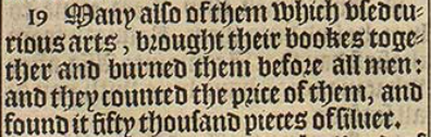 19 Many also of them which vsed curious arts, brought their bookes together and burned them before all men: and they counted the price of them, and found it fifty thousand pieces of siluer.