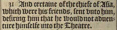 31 And certaine of the chiefe of Asia, which were his friends, sent vnto him, desiring him that he would not aduenture himselfe into the Theatre.