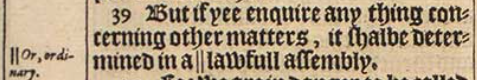 39 But if yee enquire any thing concerning other matters, it shalbe determined in a || lawfull assembly. [ || Or, ordinary. ]