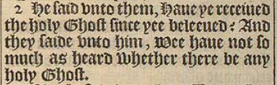 2 He said vnto them, Haue ye receiued the holy Ghost since yee beleeued? And they saide vnto him, Wee haue not so much as heard whether there be any holy Ghost.
