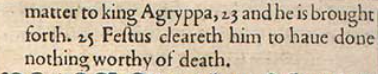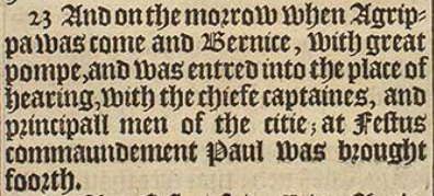 23 And on the morrow when Agrippa was come and Bernice, with great pompe, and was entred into the place of hearing, with the chiefe captaines, and principall men of the citie; at Festus commaundement Paul was brought foorth.