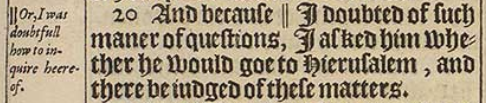 20 And because || I doubted of such maner of questions, I asked him whether he would goe to Hierusalem, and there be iudged of these matters.[||Or, I was doubtfull how to inquire heereof.]