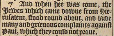 7 And when hee was come, the Iewes which came downe from Hierusalem, stood round about, and laide many and grieuous complaints against Paul, which they could not proue,