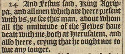 24 And Festus said, King Agrippa, and all men which are heere present with vs, ye see this man, about whom all the multitude of the Iewes haue dealt with me, both at Hierusalem, and also heere, crying that he ought not to liue any longer.