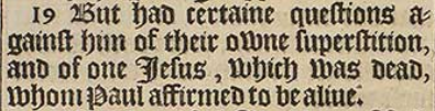 19 But had certaine questions against him of their owne superstition, and of one Iesus, which was dead, whom Paul affirmed to be aliue.