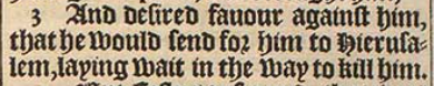 3 And desired fauour against him, that he would send for him to Hierusalem, laying wait in the way to kill him.