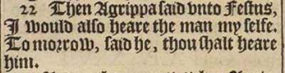 22 Then Agrippa said vnto Festus, I would also heare the man my selfe. To morrow, said he, thou shalt heare him.