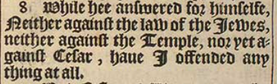 8 While hee answered for himselfe, Neither against the law of the Iewes, neither against the Temple, nor yet against Cesar, haue I offended any thing at all.